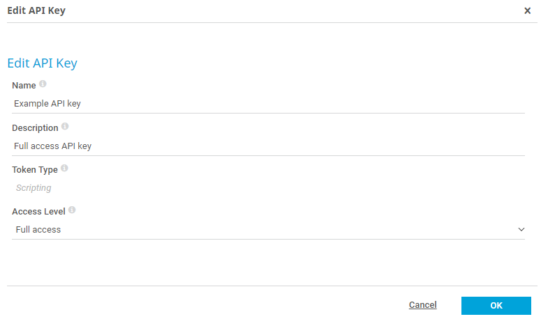 After creation, you can edit the Name, the Description, and the Access Level of your API keys.