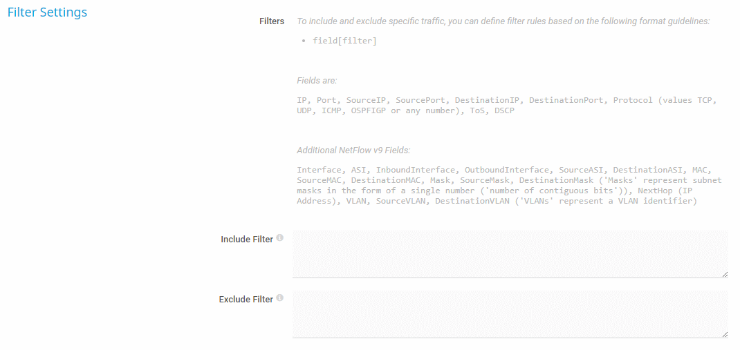Define if you want to filter any traffic. If you leave this field empty, the sensor includes all traffic. To include specific traffic only, define filters using a special syntax.