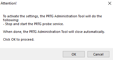 After you change settings, click Save & Close. A new window opens where PRTG asks you to agree to restart the PRTG probe service. Click OK to proceed.