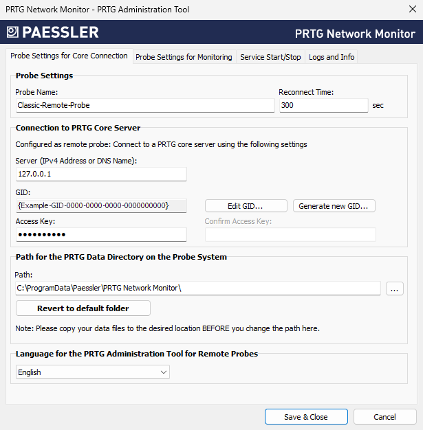 Choose the language for the PRTG Administration Tool on the remote probe. The default is English.
