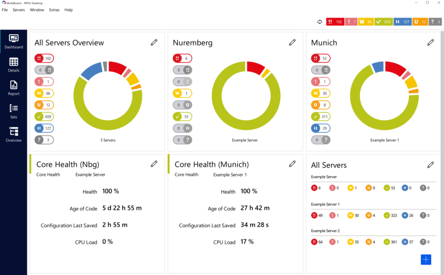 PRTG MultiBoard is a PRTG extension that functions as an alternative interface for PRTG. It is available on Windows, macOS, and Linux and you can use it to connect to one or several independent PRTG core servers or PRTG Hosted Monitor instances to configure your setup, view monitoring results, and keep an eye on your network. It is a cross-platform application for fast access to data and monitoring management.