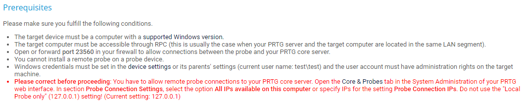 Note that installing a remote probe directly from the device tree in the PRTG web interface is an experimental feature. This approach might not be possible in all situations.