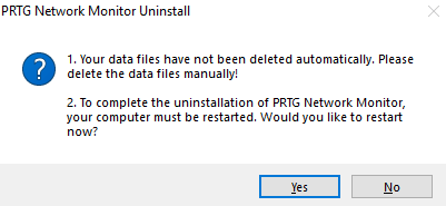 After the system restart, the software is removed, but there is still some custom data in the PRTG program directory. If you have uninstalled an entire PRTG installation or a remote probe installation, your monitoring data is still stored on the system. To completely remove all PRTG data, delete the PRTG Network Monitor folder as well as the Paessler\PRTG Network Monitor folder in the PRTG data directory.